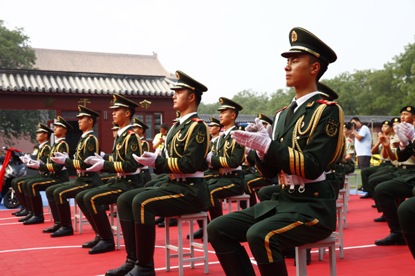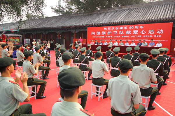在建軍90周年來臨之際,為了表達(dá)社會各界對人民子弟兵敬意和慰問,北京市體育總會、北京市社會體育管理中心、北京市體育基金會、北京市體育記者協(xié)會主辦,北京睿智翔云廣告有限公司承辦的“迎八一”走進(jìn)國旗護(hù)衛(wèi)隊(duì)獻(xiàn)愛心活動在國旗護(hù)衛(wèi)隊(duì)駐地舉行,TenCate(草坪)亞洲公司、北京火炬生地人造草坪有限公司、河南三公利華實(shí)業(yè)有限公司、北京建儂體育用品有限公司、索牌體育(深圳)股份有限公司;上海姚記撲克股份有限公司、秦皇島慈生堂食品股份有限公司、北京恒安中醫(yī)院的領(lǐng)導(dǎo)和代表來到天安門國旗護(hù)衛(wèi)隊(duì),看望和慰問駐守在天安門的國旗護(hù)衛(wèi)隊(duì)官兵。