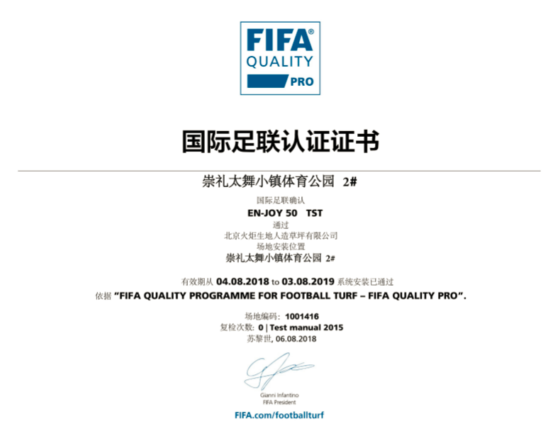 FIFA Quality Pro 是 FIFA國際足聯(lián) 認(rèn)證的標(biāo)準(zhǔn)足球場。獲得該證書的場地?fù)碛匈Y格承接FIFA賽事級別的比賽。